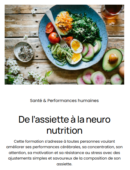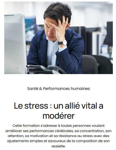 PERFORMANCE HUMAINE & QVCT 10 avr. Écrit par ALBAN TRISTAN Comprenez les mécanismes du stress, de la fatigue et de la motivation pour mieux agir en entreprise.Vous développez une approche globale alliant nutrition, mental et prévention.Un levier puissant pour booster à la fois bien-être et productivité. + + ALBAN TRISTAN